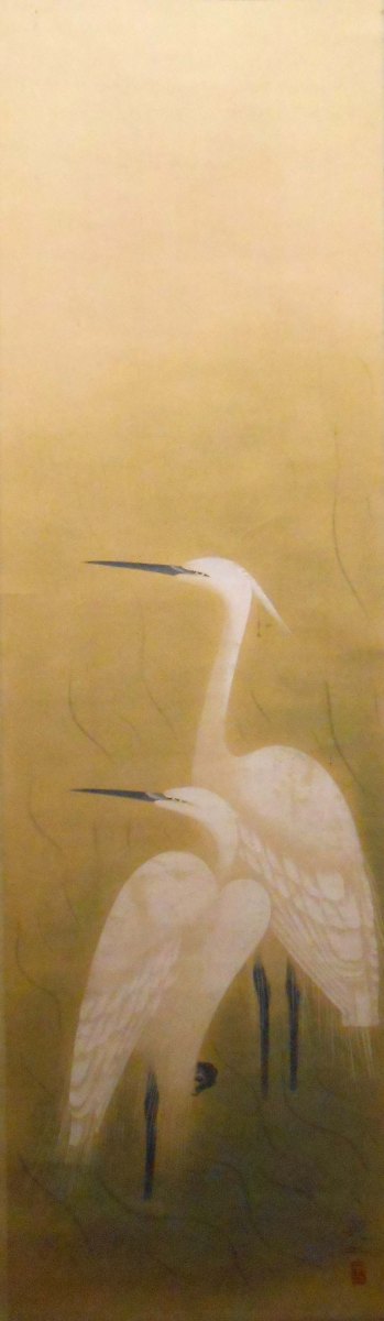 RV-244 Publicado 20 julio, 2014 en 1240 × 4264 en Galería ← Anterior Siguiente → Dos garzas Japón, primera mitad del siglo XX Firmado Eiji , con sello hanko Tinta y color sobre seda, montaje en seda Jikusaki de material sintético Rollo: 153 x 49 cm. Pintura: 123 x 36 cm.