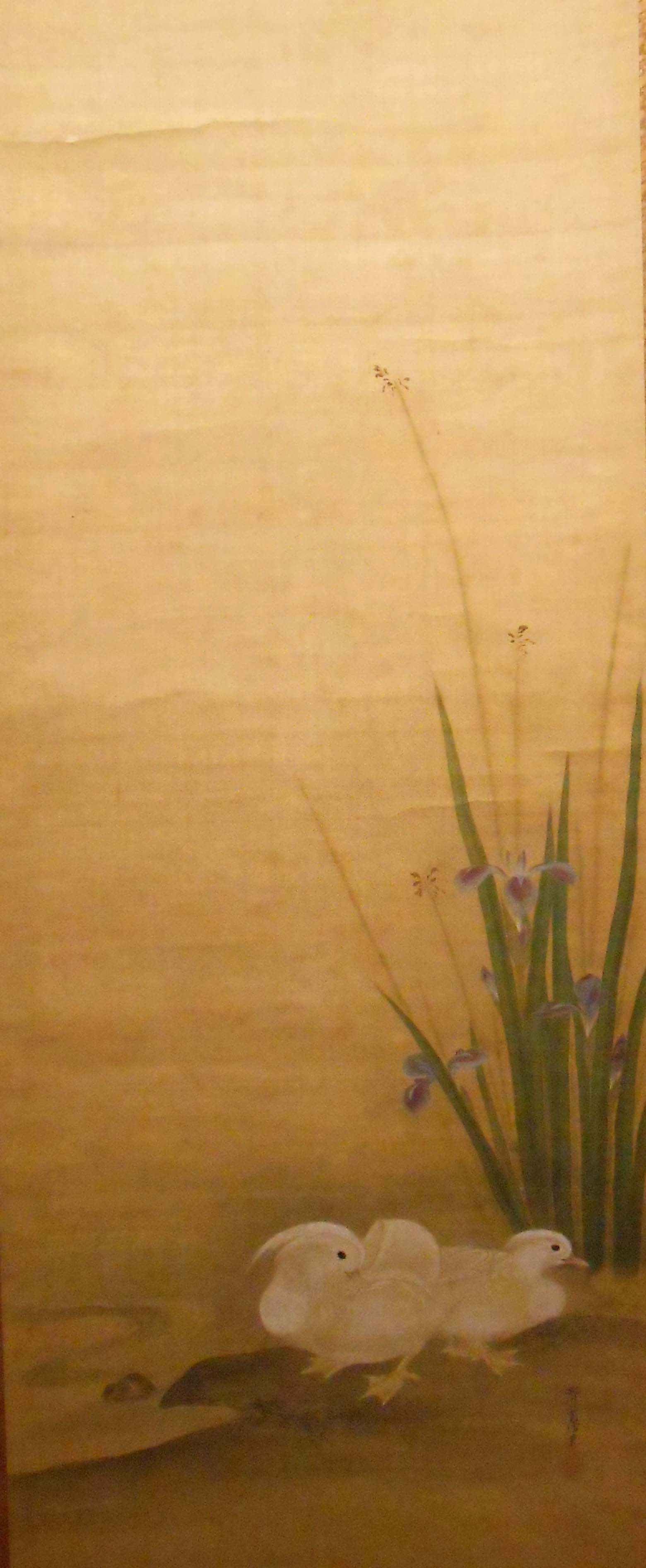 RV-252 Publicado 20 julio, 2014 en 1560 × 3784 en Galería ← Anterior Siguiente → Lirios y patos Japón Yusen Hironobu (1778-1815),escuela Kano FirmadoYusen Hironobu hitsu con sello hanko Color sobre seda, montaje en seda Jikusaki de madera Rollo: 210 x 61 cm. Pintura: 112,5 x 46,5 cm.